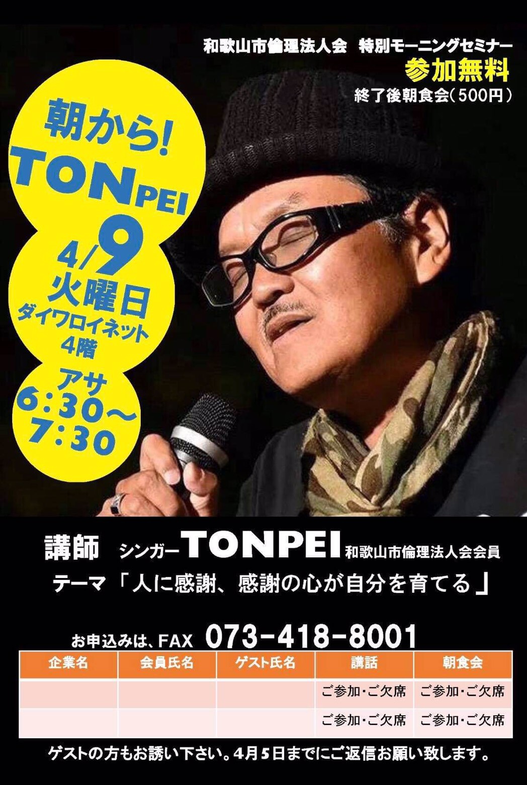4月9日(火) 朝から!TONPEI @ダイワロイネット4階 テーマ「人に感謝、感謝の心が自分を育てる」 朝 6:30〜7:30 入場無料(終了後朝食会500円) ライブ情報 2019/03/01 tonpei2020