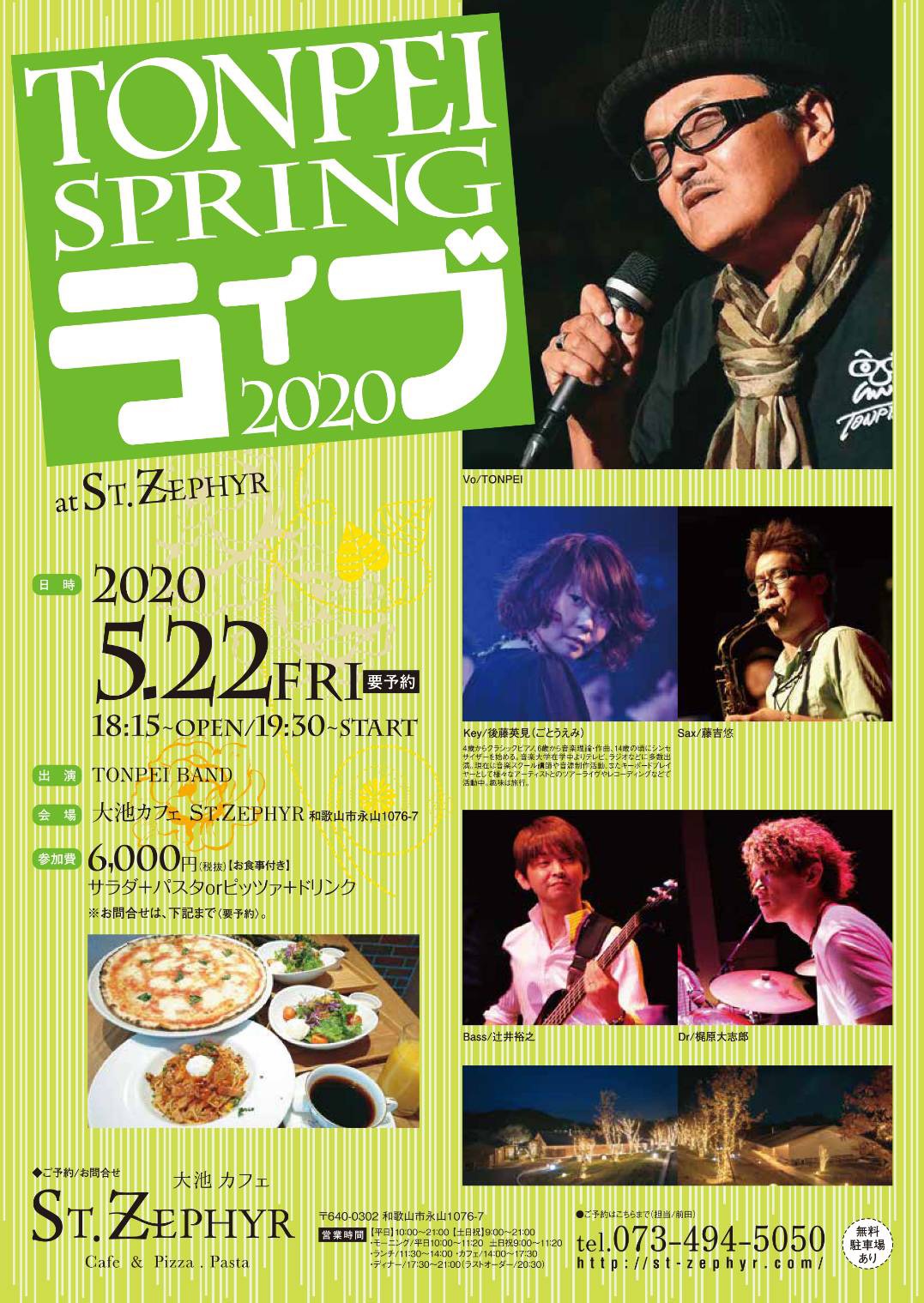大池遊園にある居心地の良いカフェ「大池カフェST.ZEPHYR」の素敵な食事と空間を楽しみながら、トンペイの歌声を聞きませんか。