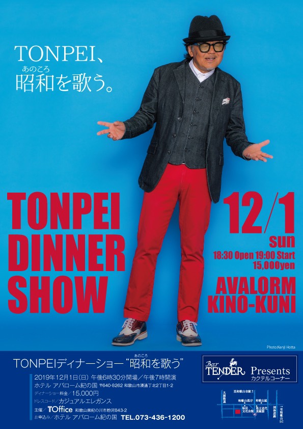 12月01日(日) OPEN 18:30 / START 19:00 ディナーショー料金:¥15,000 ドレスコード:カジュアルエレガンス お申し込み:ホテル アバローム紀の国 TEL:073-436-1200 ライブ情報 2019/11/01 tonpei2020